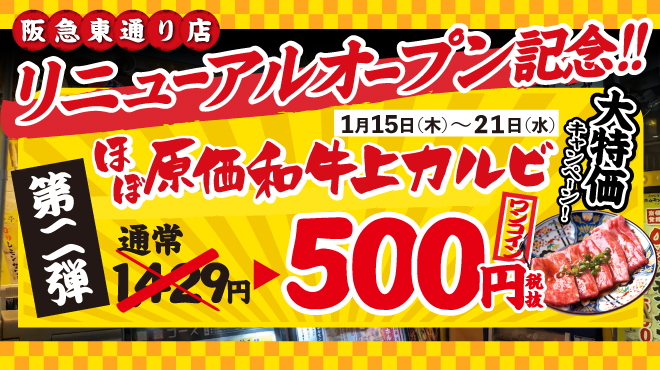 ⇒1月15日(木)から1月21日(水)まで、「黒毛和牛上カルビ」をほぼ原価⇒500円(税抜)でご提供!!
